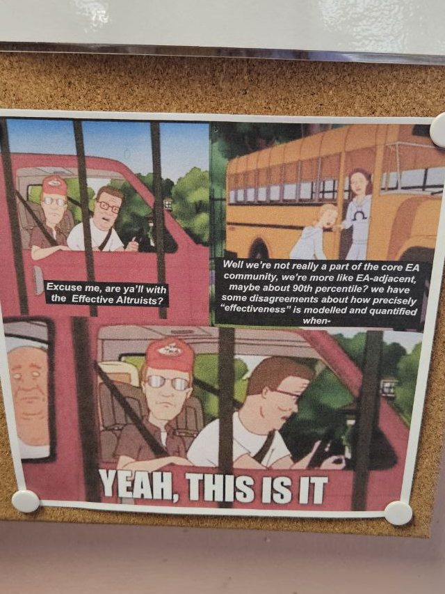 | EA is too utilitarian & dogmatic | In Oslo, as part of EA Latvia group, we had some Ukrainians, who were joking about shrimps: shrimps are somewhat famous in the animal welfare arm of EA, as animals that are farmed but neglected, so reducing their suffering can be a very cost-effective way to do good. In fact, my friend and a former co-director of Cell Ag UK James runs a podcast called “How I learnt to love shrimp”. The core postulate in these lines of thought is that suffering of any living being is equivalent, as you can never experience suffering as a shrimp. It is a great ethics question but Ukrainians kept considering how many shrimps you could save if you stopped financial support for Ukraine… which was both dark and funny. My other favourite example is that in their career advice section, 80 000 hours, EA consider professions like a medical doctor or a homeless support worker highly ineffective and with little impact, as you’d only be helping one person at a time. Below the table I’ve attached a photo from the conference to illustrate this point. At the conference some people who came to talk to me about alternative proteins were considering stuff like: would it be more impactful if I switch my career to that, or to biosecurity. I mean, you do you, but I find these a bit pointless – chance, how well you get on with your boss, and whether you had lunch that day would all have much greater impact on your daily impact (sorry), let alone your career fit and interests. I’ve also recently found out about some more EA-adjacent, or beyond-EA “schools of thought”: for example, reflective altruism blog appears interesting, and integral altruism sounds promising as a movement to me. |